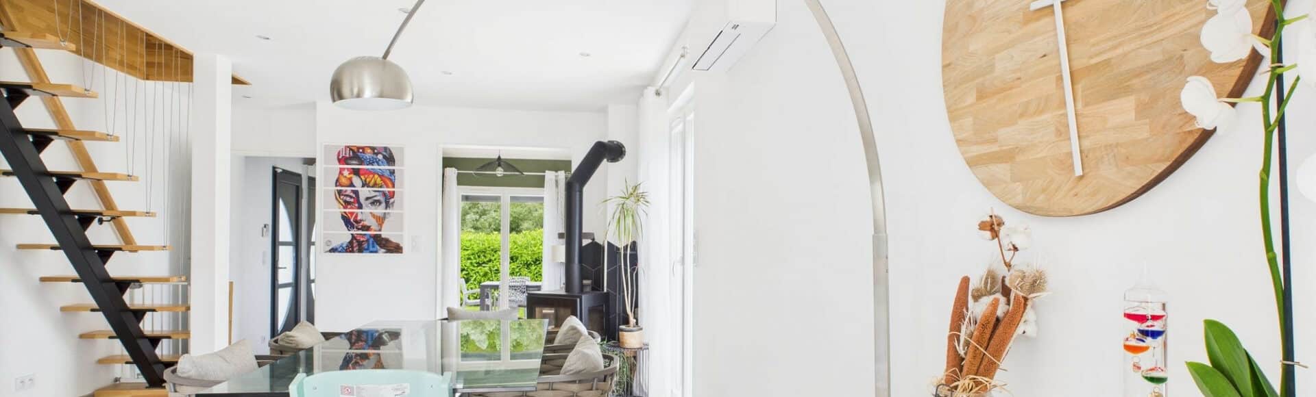 Chauffage PAC air/air + poêle à bois, climatisation, menuiseries PVC double vitrage, volets roulants électrique...