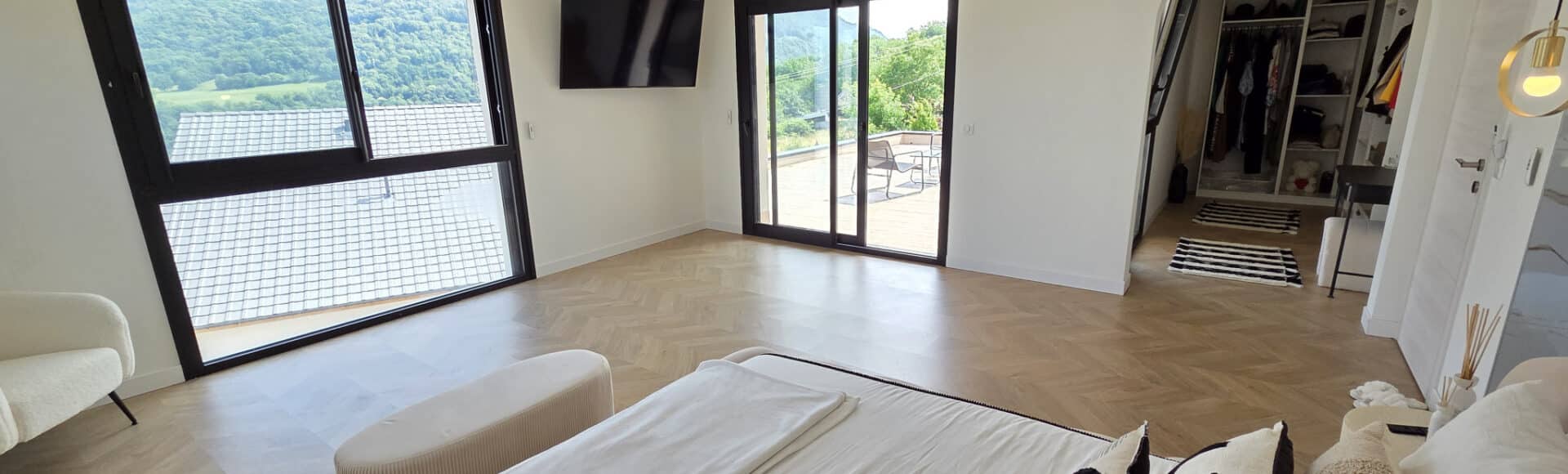Elle se compose de cinq chambres, dont une suite parentale de 50 m2 avec salle d'eau privative et accès direct à une terrasse de 50 m2 offrant une vue panoramique à 360o sur les montagnes. La cuisine moderne, entièrement équipée, s'ouvre sur un vaste séjour lumineux qui invite à la convivialité.