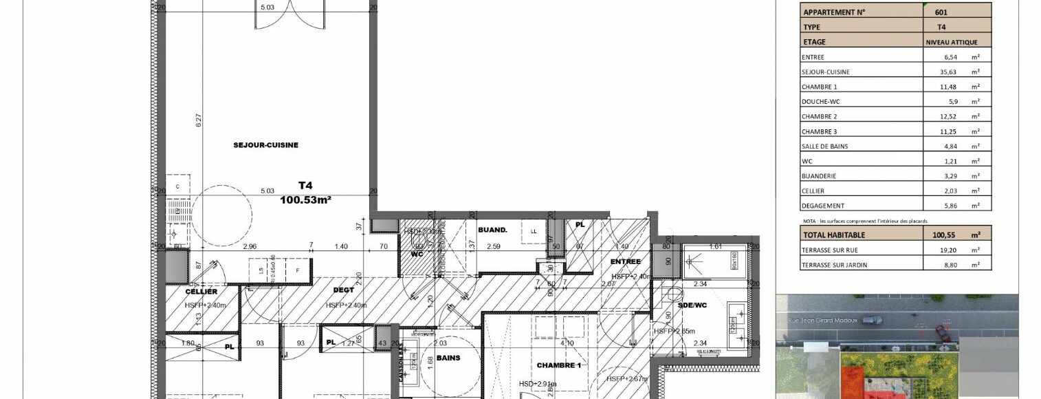 LIVRAISON IMMÉDIATE - 3E TRIMESTRE 2025 - FRAIS DE NOTAIRE RÉDUITS ! À Chambéry, 26-28 rue Jean Girard Madoux, à seulement quelques pas du centre-ville historique et de ses rues commerçantes piétonnes, découvrez « Nouvelle Ère » une résidence neuve d’exception offrant une vue panoramique sur les montagnes environnantes. Dernières opportunités à saisir ! Le lot n°601 soit un appartement 4 pièces de 100,55 m² habitables, situé en attique et orienté sud-ouest. Il bénéficie d’une terrasse de 19,20 m² et d’une seconde terrasse de 8,80 m², idéales pour profiter pleinement de la lumière et du panorama. Vendu avec 2 places de stationnement en sous-sol. Contactez-nous dès maintenant pour en savoir plus et réserver votre futur appartement au sein de cette adresse d’exception ! Frais de notaire réduits Normes NF Habitat HQE et labellisée BEPOS Effinergie 2017 Programme éligible : Pinel zone B1, Accession libre. PTZ Bien soumis au statut juridique de la Copropriété. Nb de lots : 38 (hors annexes). Pas de procédure en cours. Prix TTC et Honoraires à charge vendeur TTC Surface CARREZ : 100.55 m²