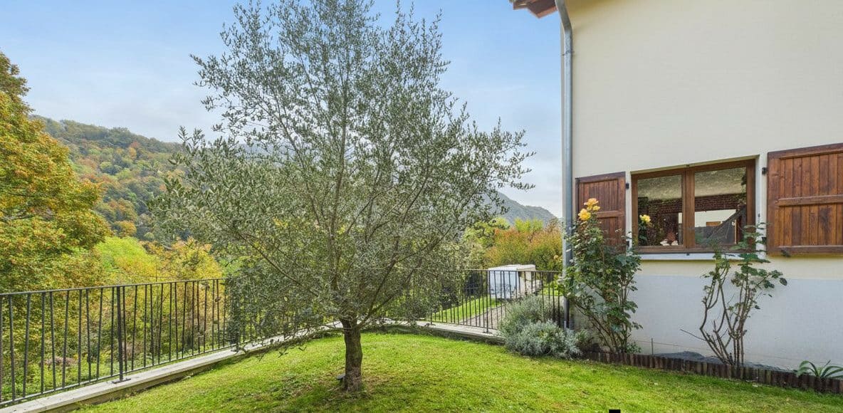 Les exterieurs : Très belle terrasse avec vue sur la cascade de Saint-Cassin ainsi qu'un jardin entièrement plat, clos et arboré.