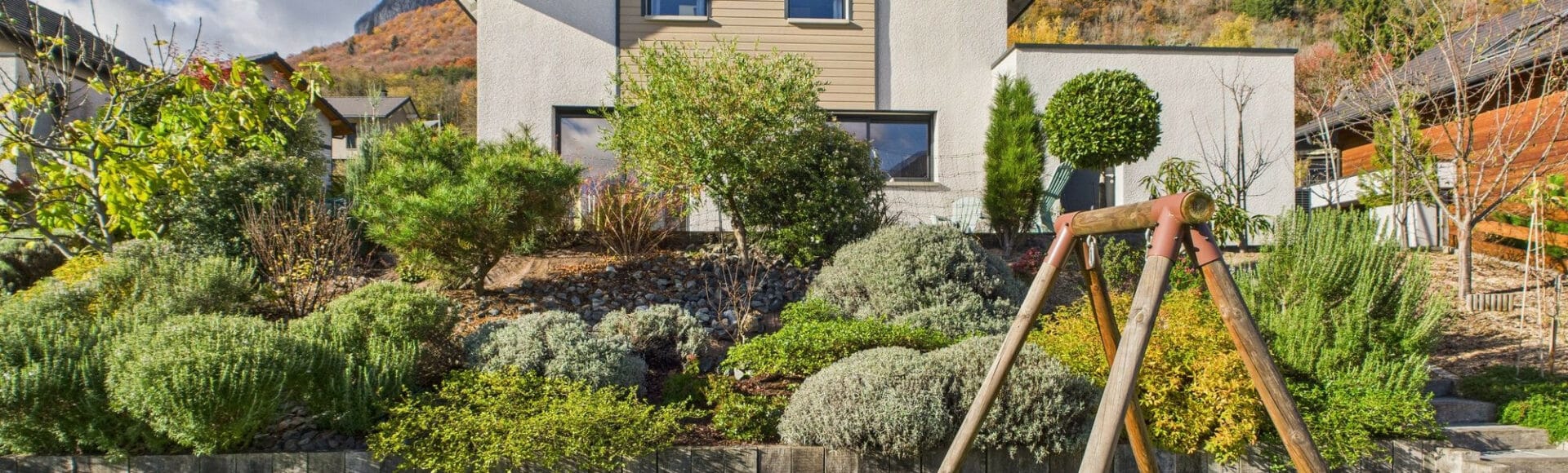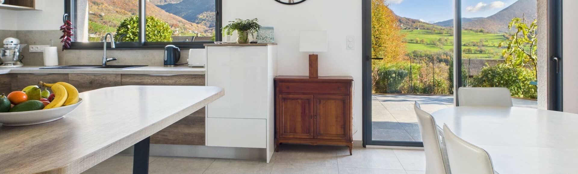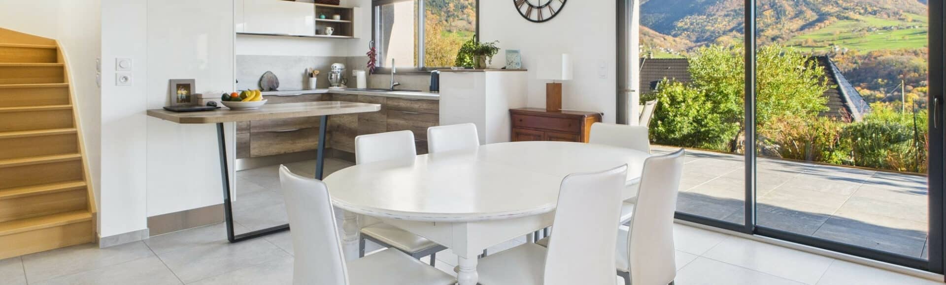 Au Rez-de-Chaussée : Entrée avec rangement, une pièce de vie lumineuse de 46m² avec sa cuisine équipée haut de gamme et une vue panoramique sur les montagnes environnante, un accès direct à la terrasse de 40m² exposée Sud-Est, une buanderie avec lavabo et un WC indépendant avec lave-main,