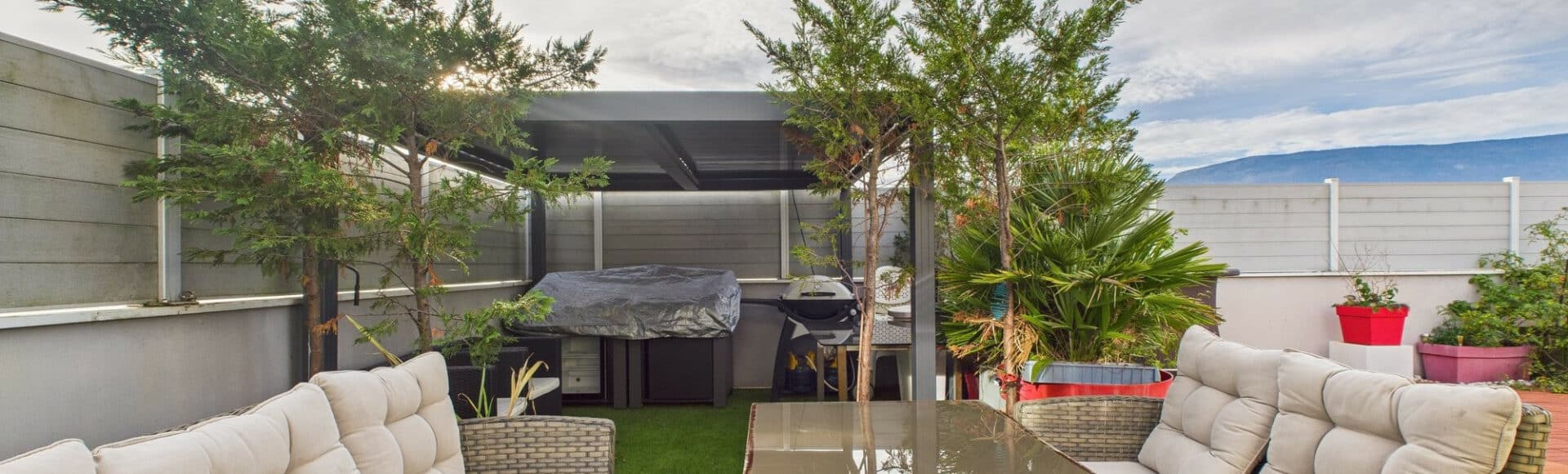 Un terrasse unique dans le secteur de 83m2 avec jaccuzzi, cuisine d'été, solarium accessible depuis la pièce de vie et les deux chambres.