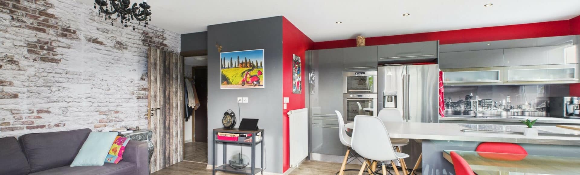 Hall d'entrée avec placard donnant sur une pièce de vie constituée de salon / salle à manger et cuisine ouverte, une salle d'eau, 2 chambres et un WC indépendant.