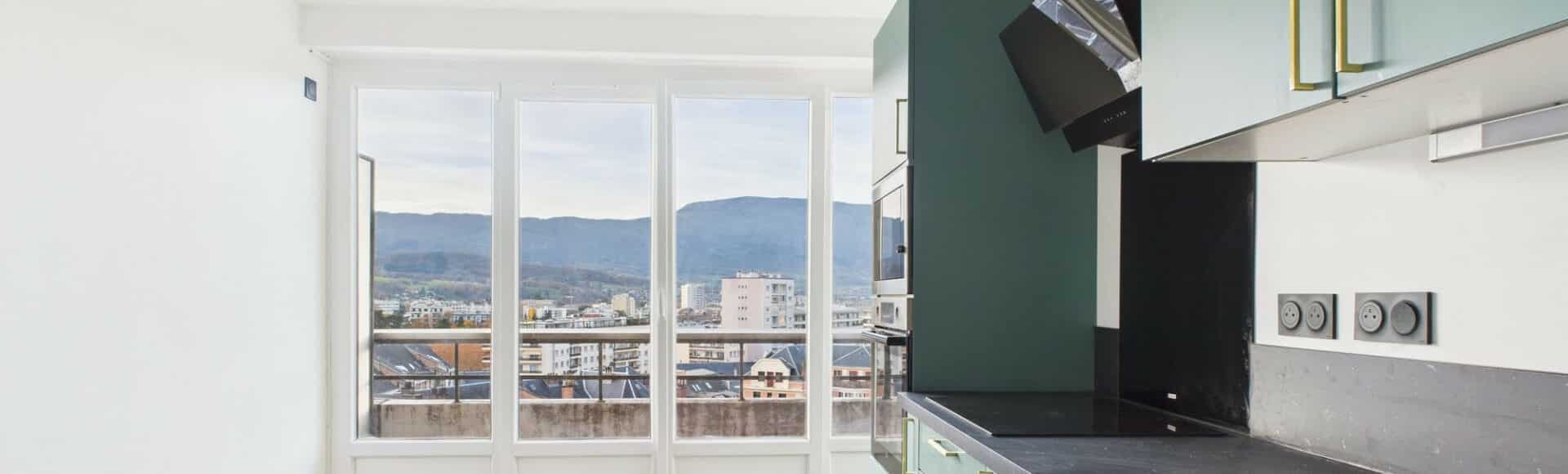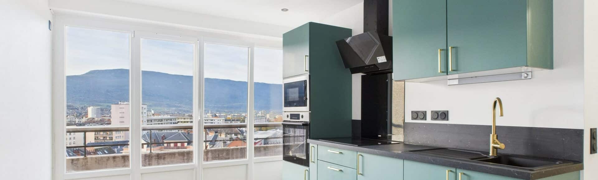 Appartement T2 entièrement rénové avec goût, au 7ème étage étage avec ascenseur de la copropriété le Centenaire, en plein centre-ville de Chambéry.