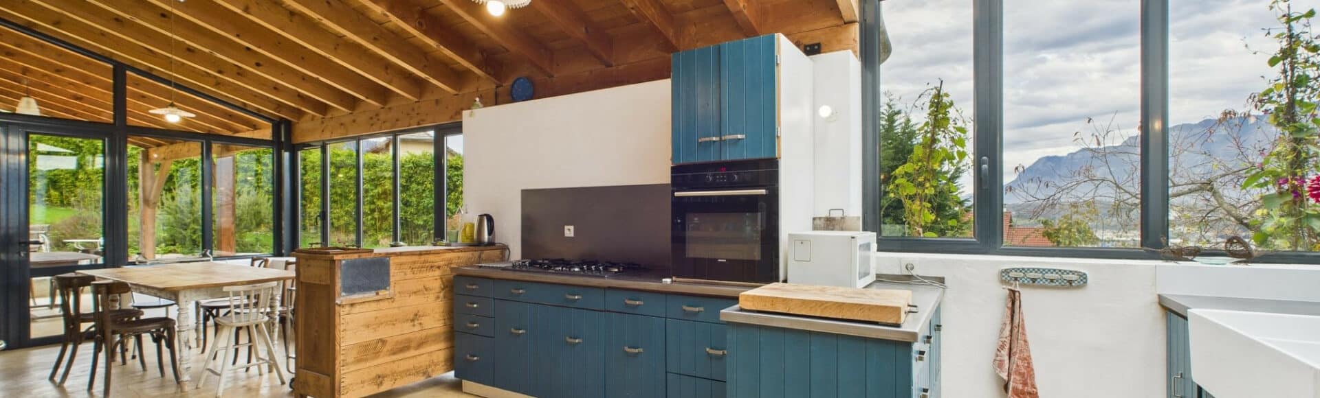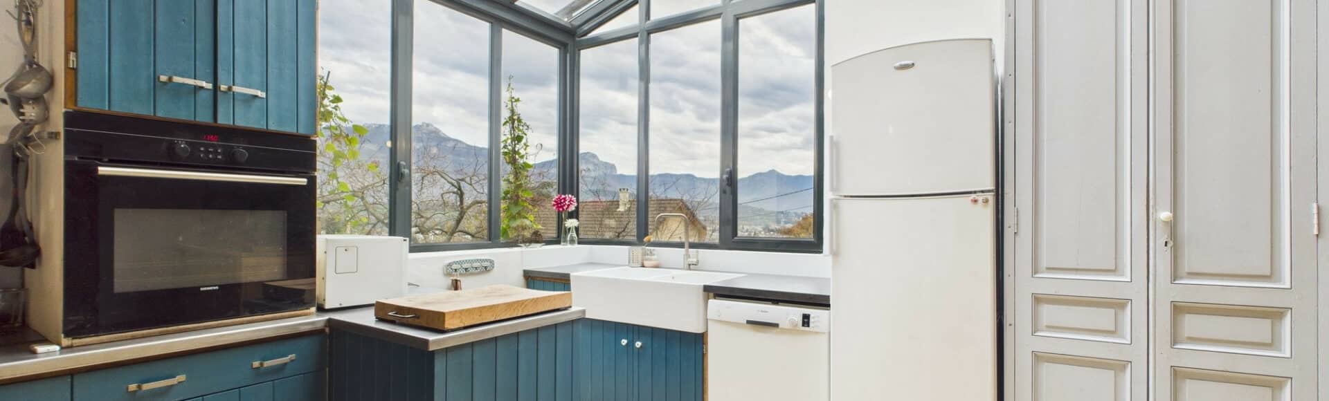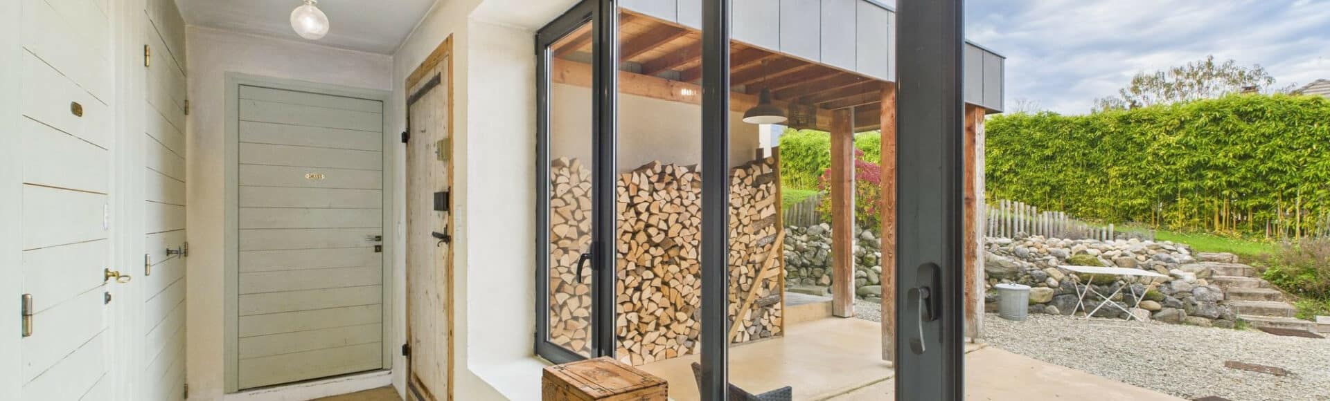 Coursive vitrée menant à la buanderie, la cave, l'atelier, le local à vélos et au parking couvert
