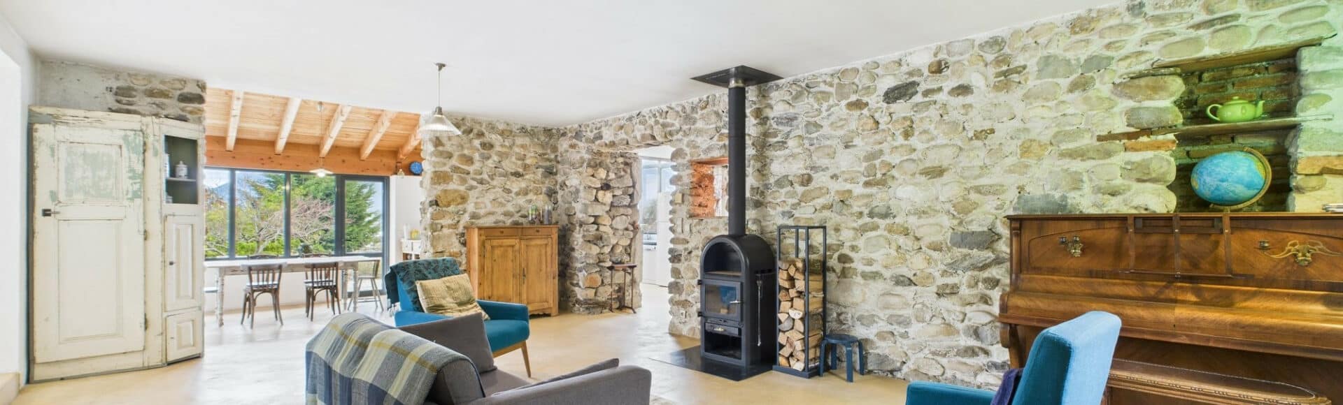 Vaste pièce de vie de 100 m², composée d'un espace repas avec cuisinière bois d'époque, d'un petit salon, d'un grand salon avec cheminée, et d'un coin bureau
