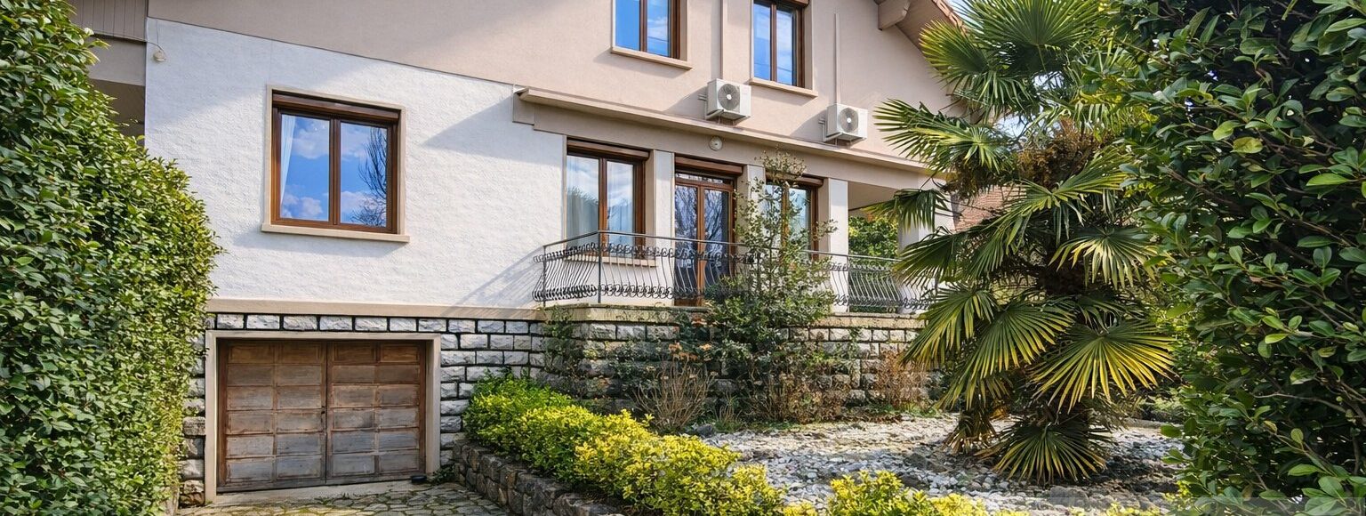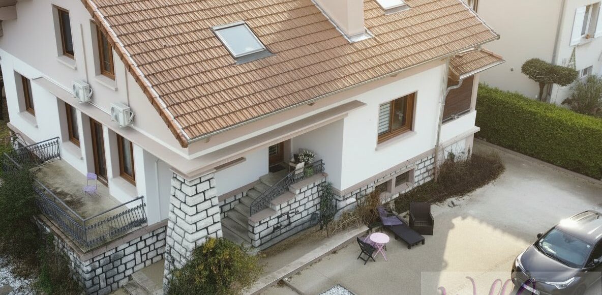 À quelques minutes à pied du centre d’Aix-les-Bains et proche du lac, cette maison de ville offre un cadre de vie recherché, alliant accessibilité, calme et proximité des commodités. Son implantation permet de rejoindre facilement écoles et transports, tout en profitant d’un environnement apprécié. D’une surface habitable de 240 m², la maison séduit par ses beaux volumes et sa grande polyvalence. Elle conviendra aussi bien à une famille en quête d’espace, avec la possibilité d’être divisée en deux logements de 120 m², qu’à l’exercice d’une activité professionnelle nécessitant une adresse visible et fonctionnelle, telle que des bureaux ou un cabinet libéral ou médical. Rénovée en 2005, la propriété très bien entrenue s’inscrit sur un terrain plat et arboré de 766 m², bénéficiant d’un bel ensoleillement. Le stationnement est aisé grâce au portail électrique offrant plusieurs emplacements extérieurs pouvant accueillir 4 ou 5 véhicules. L’entrée s’effectue par un rez-de-chaussée surélevé. Ce niveau est composé d'un hall élégant doté de rangements, un vaste salon-séjour bien éclairé prolongé par une terrasse orientée nord-ouest, ainsi qu’une cuisine indépendante ouvrant sur une loggia avec accès au jardin. Une chambre avec salle d’eau, un bureau, un WC et un point d’eau complètent ce niveau. L’étage accueille quatre chambres avec placards, une salle de bains, une buanderie et un WC indépendant. En sous-sol semi-enterré, une entrée indépendante dessert plusieurs pièces de rangement, la chaufferie, une kitchenet ainsi qu’une salle d’eau avec douche et un WC, offrant un potentiel supplémentaire appréciable pour un activité ou du stockage. La maison est équipée d’un chauffage individuel au gaz, de menuiseries en double vitrage et d’une climatisation couvrant l’ensemble de la partie habitable. La maison est équipée de panneaux solaires ainsi que d’un panneau publicitaire générant des revenus mensuels. Prix : 670 000 € honoraires à charge vendeur. Contactez moi pour toute question ou pour organiser une visite. Benjamin Marhely 06 63 32 77 70