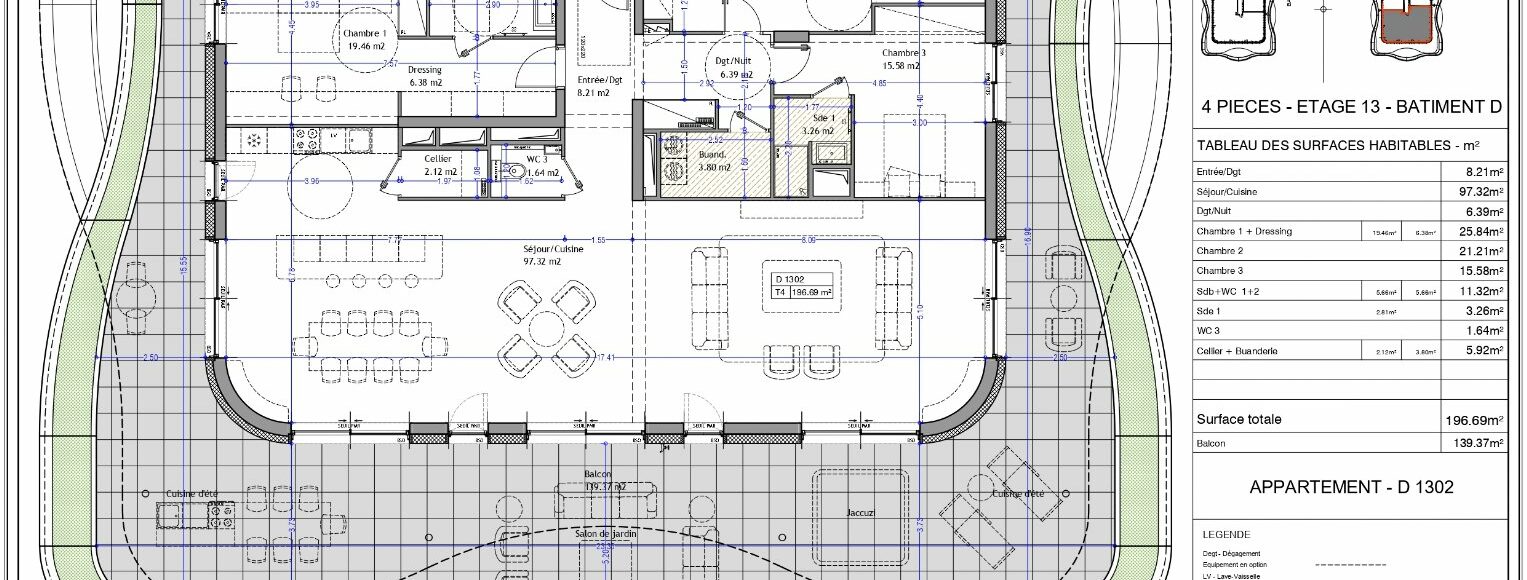 Aix-les-Bains, au cœur de la prestigieuse résidence « Les Nouveaux Thermes », découvrez cet appartement T4 d’exception de 196,69 m² situé en attique au 13ème étage du bâtiment D et bénéficiant d’une triple exposition est-OUEST-sud. Cet appartement rare séduit par une distribution intérieure remarquable : un séjour cuisine de 97,32 m² baignée de lumière grâce à de larges baies vitrées ouvrant sur un extérieur plein ciel à l’Ouest. Le balcon filant de 139,37 m², véritable espace de vie supplémentaire avec des vues dégagées sur les massifs environnants et lac. L’espace nuit se compose de 3 chambres (dont une suite parentale avec dressing/salle de bains et wc, une suite parentale avec salle d’eau et wc, une suite parentale avec salle d’eau). Une buanderie, un cellier, un WC indépendant supplémentaire et de nombreux rangements complètent cet ensemble. Vendu avec un garage au sous-sol sécurisé. Ce bien d’exception s’intègre dans une résidence aux prestations haut de gamme et à la conception environnementale exemplaire : façades végétalisées, toitures vertes, récupération des eaux pluviales, géothermie par plancher chauffant/rafraîchissant… Un appartement unique alliant volumes spectaculaires, extérieur remarquable et équipements premium au sein d’une résidence d’avant-garde. Contactez votre agence WellCome Immobilier pour découvrir et réserver cet appartement exclusif parmi les premiers lots disponibles ! Frais de notaire réduits Programme certifié RE2020 seuil 2022 & NF Habitat HQE Livraison prévue : 1er trimestre 2029 Surface CARREZ : 196.69 m²