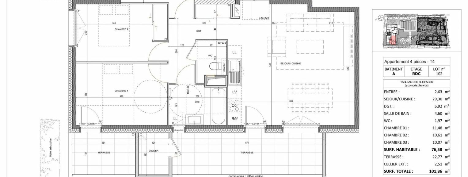 Appartement T4 neuf de 76,58 m² en RDC côté Sud – Livraison T4 2026 – Annecy À Annecy, secteur Cran-Gevrier à 15 minutes à pied du centre-ville et à proximité immédiate des commodités - Découvrez ce bel appartement 4 pièces neuf de 76,58 m² en rez-de-chaussée exposé au Sud. Frais de notaire réduits – Livraison 4ème trimestre 2026 Agencement intérieur du T4 : -Entrée : 2,63 m² -Séjour / Cuisine : 29,30 m² – exposition Sud, grande baie vitrée -Dégagement : 5,92 m² -Salle de bains : 4,60 m² -WC séparé : 1,97 m² -3 chambres : 11,48 m² – 10,61 m² – 10,07 m² L’espace de vie s’ouvre sur une spacieuse terrasse de 22,77 m² avec cellier extérieur de 2,50 m². Prestations & confort : Chauffage et eau chaude via installation collective (PAC + chaudière gaz), Menuiseries bois double vitrage, Volets roulants électriques, Porte d’entrée sécurisée, Locaux vélos et poussettes dans la résidence Stationnement sécurisé en sous-sol en option (box fermé ou place de parking). Contactez l’agence WellCome Immobilier pour plus d’informations et réserver ce bien. D’autres appartements T4 et T5 sont également disponibles dans la résidence. Frais de notaire REDUITS Livraison : 4ème Trimestre 2026 Programme au normes RE2020. Éligible Pinel (zone A), PTZ+, LLI TVA 10 %. Bien soumis au statut juridique de la Copropriété. Nb de lots : 105 Pas de procédure en cours. Prix TTC et Honoraires à charge vendeur TTC Surface CARREZ : 76.58 m²