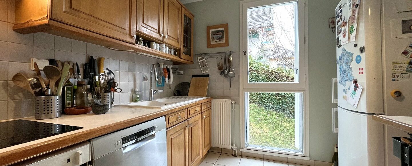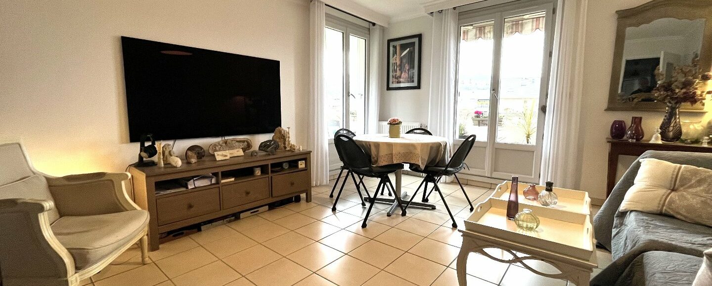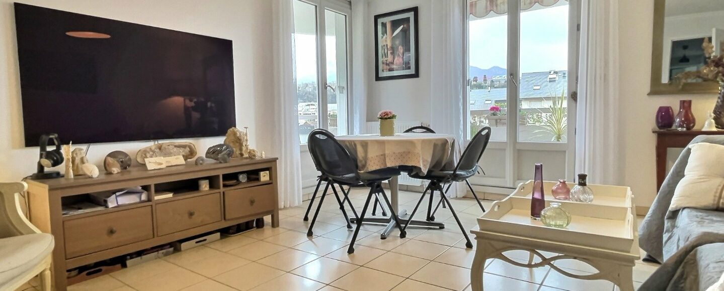 Aix proche centre au calme dans une petite résidence récemment rénovée (toiture neuve et façades repeintes) appartement type 3 expo sud et ouest avec vues dégagées sur la Dent du Chat. Ce logement fonctionnel comprend séjour sur large balcon-terrasse expo ouest, cuisine aménagée qui peut être ouverte sur le séjour après suppression de la cloison, 2 chambres avec accès balcon sud, salle d'eau récente et WC séparé. En complément vous disposerez d'une cave de 3.85m². La résidence met à disposition un parking collectif sécurisé par barrière et un local à vélos. Un grand garage peut être proposé en option. Situé en étage avec ascenseur, cet appartement bénéficie d'une luminosité optimale et offre de jolies vues. Vous pourrez vous rendre à pieds aux nombreux commerces du centre-ville. Les charges de copropriété incluent le chauffage au gaz et l'eau chaude ainsi que l'entretien des espaces verts de la copropriété. A visiter sans tarder! Bien soumis au statut juridique de la Copropriété. Nb de lots : 136 dont 48 logements répartis sur plusieurs montées. Charges annuelles de copropriété (Montant moyen annuel quote-part du budget prévisionnel vendeur) : 3 091,47 € incluant syndic, chauffage et eau chaude avec répartiteurs, entretien du parc et des communs. Honoraires à la charge du vendeur