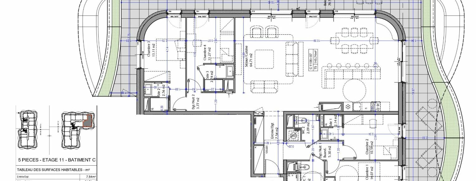 Appartement PREMIUM T5 de 145m² au 11ème Côté SUD – « Les Nouveaux Thermes » à Aix-les-Bains À Aix-les-Bains, en cœur de ville au sein de la prestigieuse résidence « Les Nouveaux Thermes » découvrez cet appartement 5 pièces de 145,74m² au 10ème étage côté Sud (triple exposition Est-Sud-Ouest). Cet appartement de prestige se distingue par ses volumes spectaculaires, sa luminosité omniprésente et une distribution pensée pour un confort de vie haut de gamme. Description de l’appartement T5 : -Séjour / Cuisine : 64,71 m² côté Sud -Entrée / dégagement et Dégagement nuit -4 chambres : 14,07 m², 10,59 m², 13,11 m² et 11,27 m² -1 salle de bains avec WC, 3 salles d’eau -1 WC indépendant L’appartement s’ouvre sur un balcon végétalisé de 79,59 m² en triple exposition Est-Sud-Ouest offrant une vue panoramique sur le lac, les massifs environnants et la ville, un atout rare pour un appartement en attique à Aix-les-Bains. Vendu avec 2 garages au sous-sol sécurisé. Présence de locaux vélos et poussettes sécurisés. Prestations haut de gamme : Plancher chauffant et rafraîchissant par géothermie. Menuiseries aluminium double vitrage. Brise-soleil orientables (BSO) et volets roulants électriques. Possibilité de personnalisation des finitions intérieurs. Une résidence contemporaine à haute performance environnementale : Façades et toitures végétalisées, Récupération des eaux pluviales, Chauffage et rafraîchissement par géothermie. Contactez votre agence WellCome Immobilier à Aix-les-Bains pour réserver cet appartement d’exception parmi les lots disponibles ! Livraison prévue : 1er Trimestre 2029 Frais de notaire réduits Programme certifié RE2020 seuil 2022 & NF Habitat HQE