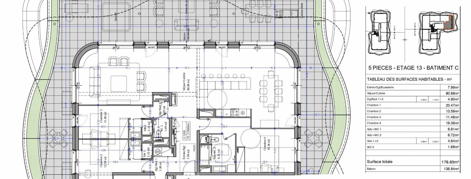 Appartement PREMIUM T5 de 178 m² en attique – 2 Box – Résidence « Les Nouveaux Thermes » à Aix-les-Bains A Aix-les-Bains, en cœur de ville au sein de la résidence haut de gamme « Les Nouveaux Thermes » découvrez ce rare appartement 5 pièces de 178,63 m² niché en attique au 13ème et dernier étage. Bénéficiant d’une triple exposition Est / Sud / Ouest, ce bien d’exception séduit par ses volumes spectaculaires, sa luminosité omniprésente et une distribution pensée pour un confort de vie haut de gamme. L’appartement se compose de : -Une entrée avec dégagement et buanderie -Un vaste séjour avec cuisine ouverte de 80,88 m² exposé Sud et Ouest -2 dégagements nuit -4 chambres de 20,47 m², 19,36 m², 13,59 m² et 11,48 m² -2 salles de bains avec WC -2 salles d’eau - WC indépendant À l’extérieur, un exceptionnel balcon végétalisé de 138,84 m² en triple exposition E/S/O offre une vue dégagée sur le lac et les montagnes, créant un cadre de vie unique et privilégié. Vendu avec 2 garages sécurisés en sous-sol. La résidence dispose également de locaux vélos et poussettes sécurisés. Prestations intérieures haut de gamme : Hauteur sous plafond de 2,98 m, plancher chauffant et rafraîchissant par géothermie, menuiseries aluminium double vitrage, brise-soleil orientables (BSO) et volets roulants électriques. Possibilité de personnalisation des finitions intérieures. Une résidence contemporaine à haute performance environnementale : Façades et toitures végétalisées, récupération des eaux pluviales, chauffage et rafraîchissement par géothermie. Contactez votre agence WellCome Immobilier à Aix-les-Bains pour réserver cet appartement d’exception parmi les lots disponibles ! Frais de notaire réduits Programme certifié RE2020 seuil 2022 & NF Habitat HQE Livraison : 1er trimestre 2029 Surface CARREZ : 178.63 m²