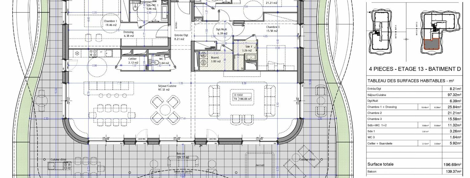 Appartement PREMIUM T4 de 196 m² en attique – « Les Nouveaux Thermes » à Aix-les-Bains À Aix-les-Bains, en cœur de ville au sein de la prestigieuse résidence « Les Nouveaux Thermes » découvrez cet appartement 4 pièces de 196m² en attique au 13ème étage côté Ouest (triple exposition Nord-Ouest-Sud). Cet appartement de prestige se distingue par ses volumes spectaculaires, sa luminosité omniprésente et une distribution pensée pour un confort de vie haut de gamme. Description de l’appartement T4 : -Séjour / Cuisine : 97,32 m² -Entrée / dégagement et Dégagement nuit -3 chambres : 19,46 m², 21,21 m² et 15,58 m² -1 dressing -2 salles de bains avec WC et 1 salle d’eau -1 WC indépendant -1 cellier et 1 buanderie L’appartement s’ouvre sur un balcon végétalisé de 139,37 m² en triple exposition Nord-Ouest-Sud offrant une vue panoramique sur le lac, les massifs environnants et la ville, un atout rare pour un appartement en attique à Aix-les-Bains. 1 garage double au sous-sol sécurisé inclus. Présence de locaux vélos et poussettes sécurisés. Prestations haut de gamme : Hauteur sous plafond 2,98m. Plancher chauffant et rafraîchissant par géothermie. Menuiseries aluminium double vitrage. Brise-soleil orientables (BSO) et volets roulants électriques. Possibilité de personnalisation des finitions intérieurs. Une résidence contemporaine à haute performance environnementale : Façades et toitures végétalisées, Récupération des eaux pluviales, Chauffage et rafraîchissement par géothermie. Contactez votre agence WellCome Immobilier à Aix-les-Bains pour réserver cet appartement d’exception parmi les lots disponibles ! Livraison prévue : 1er Trimestre 2029 Frais de notaire réduits Programme certifié RE2020 seuil 2022 & NF Habitat HQE Surface CARREZ : 196.69 m²