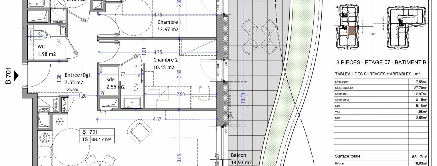 Appartement T3 de 68 m² en VEFA au 7ème étage SUD + Box inclus – Résidence « Les Nouveaux Thermes » À Aix-les-Bains, en cœur de ville au sein de la prestigieuse résidence « Les Nouveaux Thermes » découvrez cet appartement 3 pièces de 68,17m² côté Sud au 7ème étage sur 13. Description de l’appartement T3 : -Entrée/Dgt : 7,55m² -Séjour/Cuisine : 27,79m² -1 Chambre avec salle d'eau : 12,70m² -1 Chambre : 10,15m² -Salle de bain : 5,18m² -WC : 1,98m² L’appartement s’ouvre sur un balcon végétalisé de 18,93m² côté Sud. Vendu avec 1 box au sous-sol sécurisé. Présence de locaux vélos et poussettes sécurisés. Prestations haut de gamme : Plancher chauffant et rafraîchissant par géothermie. Menuiseries aluminium double vitrage. Brise-soleil orientables (BSO) et volets roulants électriques. Possibilité de personnalisation des finitions intérieurs. Une résidence contemporaine à haute performance environnementale : Façades et toitures végétalisées, Récupération des eaux pluviales, Chauffage et rafraîchissement par géothermie. Contactez votre agence WellCome Immobilier à Aix-les-Bains pour réserver cet appartement d’exception parmi les lots disponibles ! Livraison prévue : 4ème Trimestre 2028 Frais de notaire réduits Programme certifié RE2020 seuil 2022 & NF Habitat HQE Surface CARREZ : 68.17 m²
