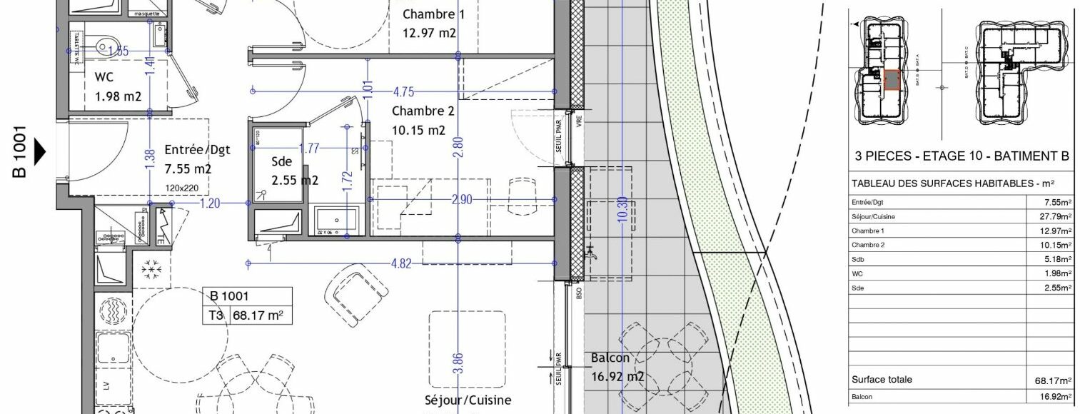 Appartement neuf T3 de 68 m² au 10ème étage SUD + 1 Parking – « Les Nouveaux Thermes » à Aix-les-Bains À Aix-les-Bains, en cœur de ville au sein de la prestigieuse résidence « Les Nouveaux Thermes », découvrez cet appartement 3 pièces de 68,17 m² au 10ème étage sur 13 côté Sud. Cet appartement de standing séduit par ses volumes généreux, sa luminosité et une distribution pensée pour un confort haut de gamme. Description de l’appartement T3 : -Entrée/Dgt : 7,55m² -Séjour/Cuisine : 27,79m² -1 Chambre avec salle d’eau : 12,70m² -1 Chambre : 12,97m² -Salle de bain : 5,18m² -WC : 1,98m² L’appartement s’ouvre sur un balcon végétalisé de 16,92m² orienté Sud. Vendu avec 1 parking en sous-sol sécurisé. Présence de locaux vélos et poussettes sécurisés. Prestations haut de gamme : plancher chauffant et rafraîchissant par géothermie, menuiseries aluminium double vitrage, brise-soleil orientables (BSO) et volets roulants électriques. Personnalisation possible des finitions intérieures. Résidence contemporaine à haute performance environnementale : façades et toitures végétalisées, récupération des eaux pluviales, chauffage et rafraîchissement par géothermie. Contactez votre agence WellCome Immobilier à Aix-les-Bains pour réserver cet appartement d’exception parmi les lots disponibles ! Livraison prévue : 4ème Trimestre 2028 Frais de notaire réduits Programme certifié RE2020 seuil 2022 & NF Habitat HQE Surface CARREZ : 68.17 m²