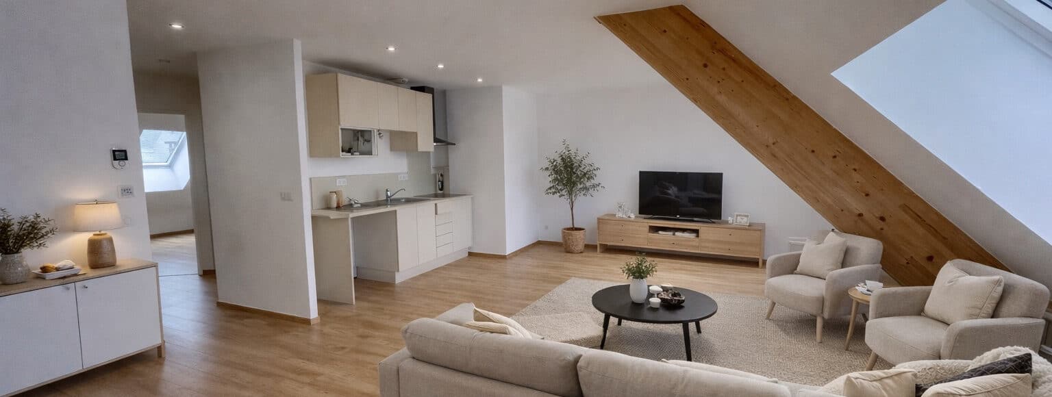 une vaste pièce de vie avec cuisine équipée de 48m2