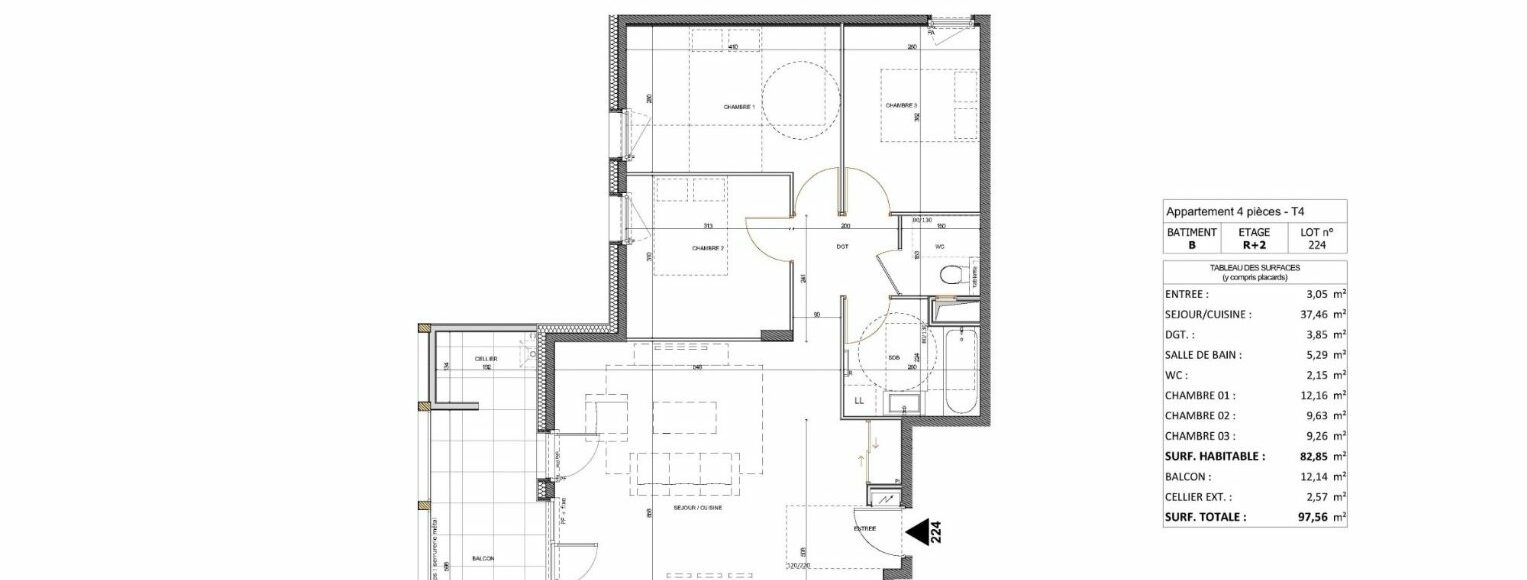 À Annecy, secteur Cran-Gevrier sur l’Av de la République à 8 min du lac d’Annecy, 15 min à pied du centre-ville et à proximité immédiate des commodités - Découvrez ce bel appartement neuf 4 pièces de 82,85 m² situé au 2ème étage côté N-O au sein du bâtiment B (2/5) de la nouvelle résidence « Passage de Flore », dont la livraison est prévue à partir de l'été 2026. La résidence calme et contemporaine se compose de 5 bâtiments harmonieusement intégrés dans un écrin de verdure. Composition de l’appartement T4 : -Entrée : 3,05 m² -Séjour / cuisine : 37,46 m² -Dégagement : 3,85 m² -Salle de bains : 5,29 m² -WC séparé : 2,15 m² -3 Chambres : 12,16 m², 9,63 m² et 9,26 m² L’appartement bénéficie d’un balcon de 12,14m² côté Ouest ainsi que d’un cellier extérieur de 2,57 m². Vendu avec 1 place de parking au sous-sol. Présence de locaux vélos et poussettes. Prestations & équipements : Le chauffage et l’eau chaude sanitaire sont assurés par une installation collective combinant PAC et chaudière gaz. Les huisseries sont en bois double vitrage avec volets roulants électrique. Porte d’entrée sécurisée. Contactez votre agence WellCome Immobilier pour obtenir plus d’informations et réserver cet appartement ! D’autres T4 et T5 sont disponibles dans la résidence. Frais de notaire OFFERTS. Programme au normes RE2020. Éligible Pinel (zone A), PTZ+, LLI TVA 10 %. Bien soumis au statut juridique de la Copropriété. Nb de lots : 105. Pas de procédure en cours. Prix TTC et Honoraires à charge vendeur TTC