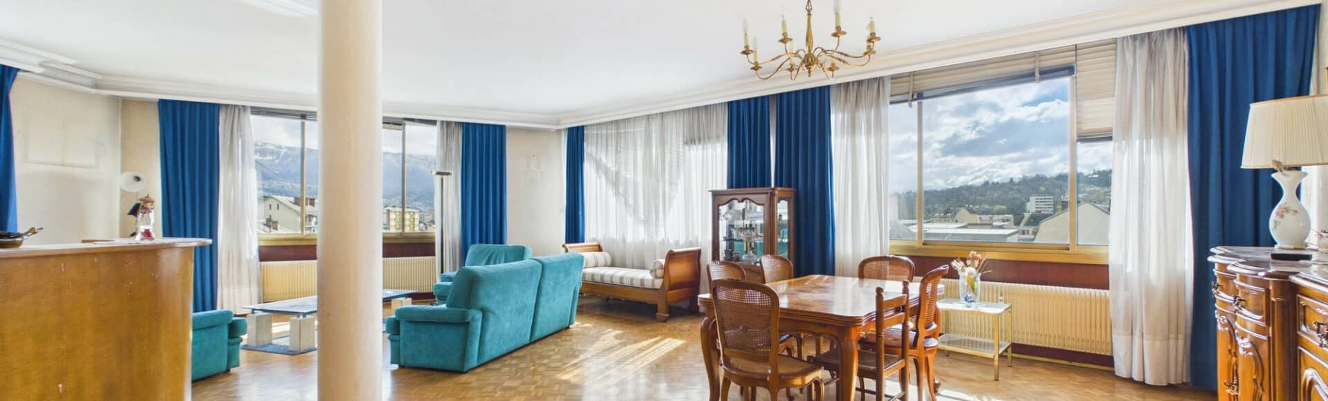 Descriptif : Hall d'entrée avec placards distribuant une vaste pièce de vie très lumineuse de 57m² bénéficiant d'une triple exposition et d'une vue panoramique.