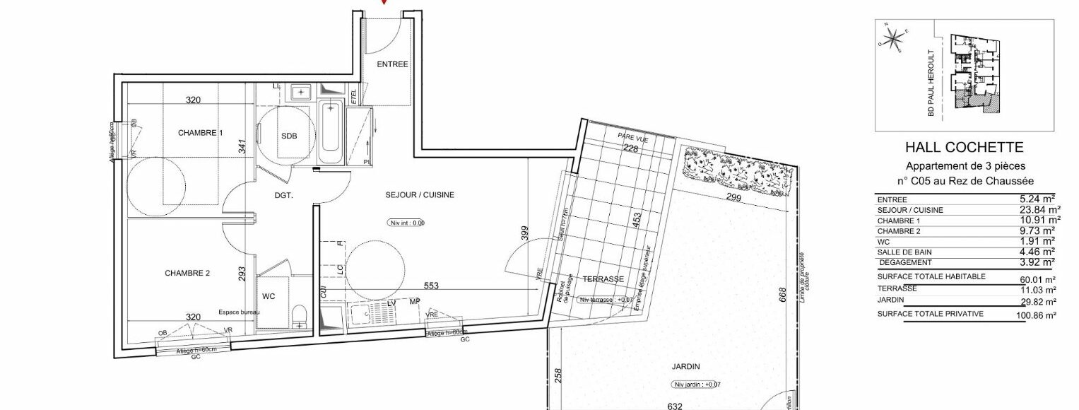 À Cognin, aux portes de Chambéry, à seulement 7 minutes du centre-ville, découvrez la nouvelle résidence « SCALA », idéalement située dans un secteur résidentiel recherché, à proximité immédiate des commodités (commerces, écoles, transports) et offrant de belles vues dégagées sur les reliefs montagneux. Profitez d’une offre en cours avec frais de notaire réduits, pour une livraison prévue au 2ème trimestre 2028, actable dès maintenant. Cette résidence à l’architecture élégante se compose de 5 bâtiments de 6 étages maximum, parfaitement intégrés dans un environnement verdoyant avec cœur d’îlot paysager, offrant un cadre de vie agréable entre nature et ville. Nous vous proposons ici un appartement 3 pièces de 60 m², situé au RDC, conçu pour offrir confort, fonctionnalité et luminosité naturelle. Il se compose de : Une entrée (5,24 m²) Un séjour avec cuisine ouverte (23,84 m²) Une chambre 1 (10,91 m²) Une chambre 2 (9,73 m²) Une salle de bain (4,46m²) WC (m 1,91²) Dégagement (3,92m²) Vendu avec box électrique privative en sous-sol, l’appartement bénéficie également d’un accès à un local à vélos au sein d’une résidence sécurisée. Idéal pour habiter, réaliser un premier achat, disposer d’un pied-à-terre ou investir dans une ville dynamique aux portes des Alpes. Contactez-nous dès maintenant pour en savoir plus et réserver votre futur appartement parmi les premiers lots disponibles ! Programme certifié NF Habitat et conforme à la RT 2012. Éligible aux dispositifs Pinel (zone B1), PTZ, LLI, LMNP et LMP. Bien soumis au statut de la copropriété – 140 lots (hors annexes). Aucune procédure en cours. Prix TTC – Honoraires à la charge du vendeur. Surface CARREZ : 60.01 m²