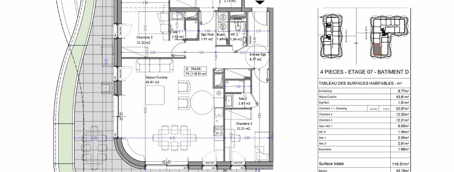 Appartement PREMIUM T4 de 116 m² côté N-O + 2 Box inclus À Aix-les-Bains, en cœur de ville au sein de la prestigieuse résidence « Les Nouveaux Thermes » découvrez cet appartement 4 pièces de 116,51m² au 7ème étage sur 13 côté Nord-Ouest. Cet appartement de prestige se distingue par ses volumes spectaculaires, sa luminosité omniprésente et une distribution pensée pour un confort de vie haut de gamme. Description de l’appartement T4 : -Entrée/Dégagement et Dégagement nuit : 10,68m² -Séjour/Cuisine : 43,81m² -2 Chambres avec salle d'eau : 15,02m² et 14,87m² -1 Chambres avec salle de bains, wc et buanderie : 28,9m² -WC indépendant : 1,54m² -Buanderie : 1,69m² L’appartement s’ouvre sur un balcon végétalisé de 44,15m² en double exposition (Nord-Ouest) offrant une vue panoramique dégagée sur les massifs environnants, le lac et la ville un atout rare pour un appartement en attique à Aix-les-Bains. Vendu avec 2 garage au sous-sol sécurisé. Présence de locaux vélos. Prestations haut de gamme : Plancher chauffant et rafraîchissant par géothermie. Menuiseries aluminium double vitrage. Brise-soleil orientables (BSO) et volets roulants électriques. Possibilité de personnalisation des finitions intérieurs. Une résidence contemporaine à haute performance environnementale : Façades et toitures végétalisées, Récupération des eaux pluviales, Chauffage et rafraîchissement par géothermie. D’autres appartements T4 sont disponibles dans la résidence (de 103m² à 196m² au prix de 995 000 € à 2 699 000 €). Pour plus d’informations et pour réserver votre futur appartement contactez votre agence WellCome Immobilier ! Visite virutelle sur demande. Livraison prévue : 1er Trimestre 2029. Frais de notaire réduits. Programme certifié RE2020 seuil 2022 & NF Habitat HQE Surface CARREZ : 116.51 m²