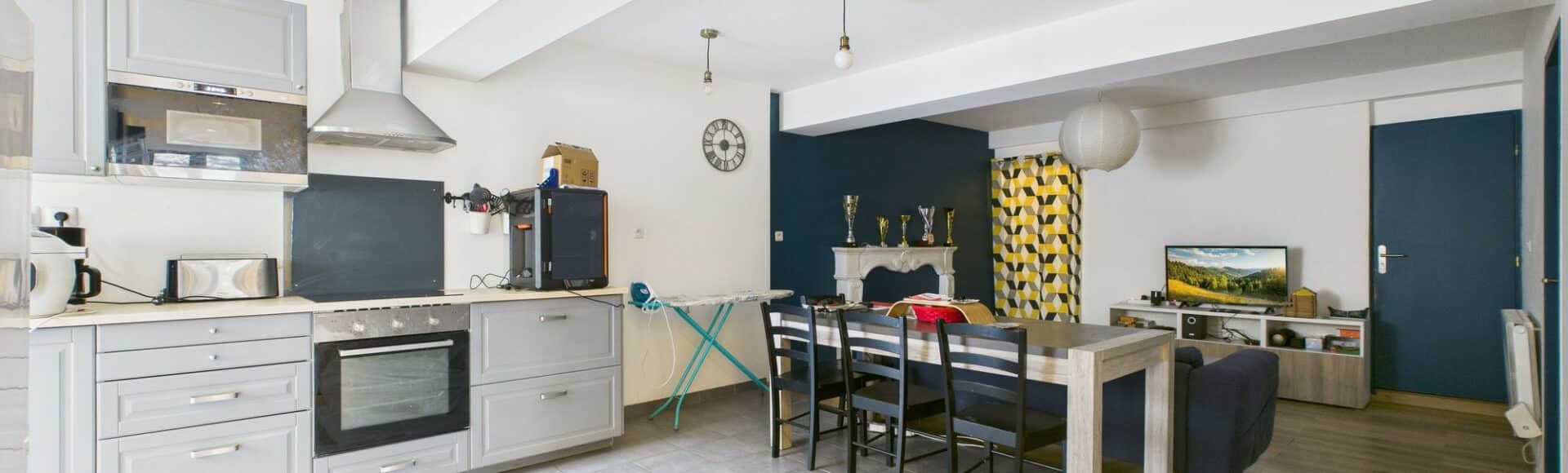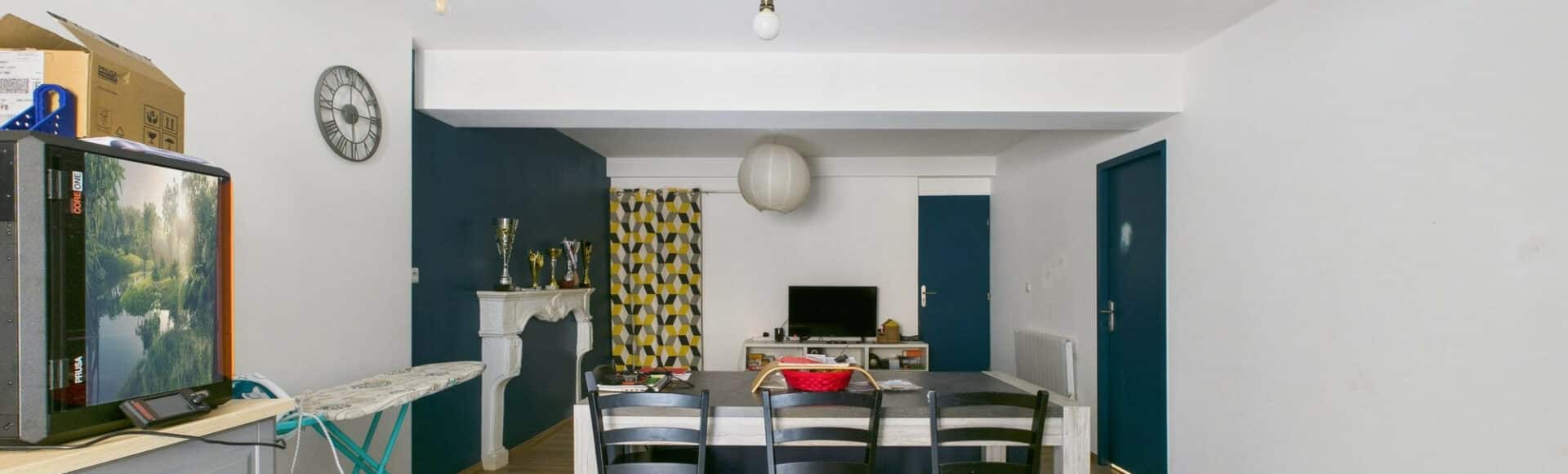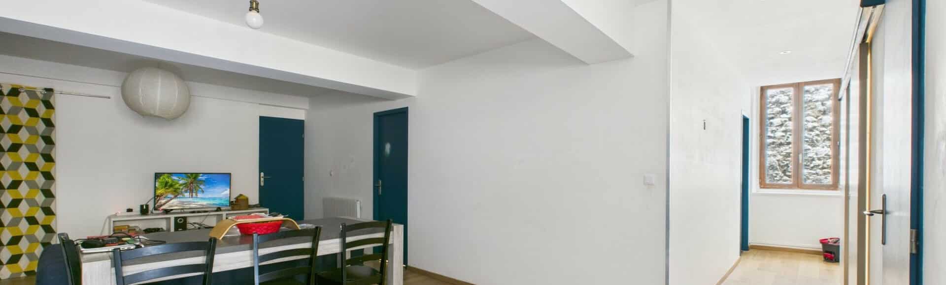 Descriptif : Une entrée de 6,59 m² menant à un couloir qui dessert une pièce principale de 31,31 m² avec cuisine équipée et aménagée, trois chambres dont une libre de 11,93 m², un WC séparé, une salle d'eau et une buanderie avec évier.La chambre disponible est meublée conformément aux photos.Une cave au rez-de-chaussée complète ce bien.